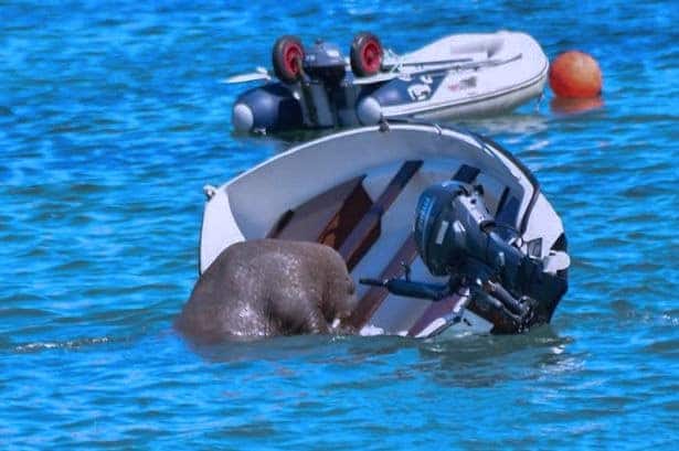 Wally the wandering Walrus is not making friends with local boat owners in Wales. Unfortunately all Wally is trying to do is find a place to take a nap and some of his attempts have been more successful than others. Seems that Wally likes trying different boats for size, and usually struggles to squeeze his huge body onto the vessel.